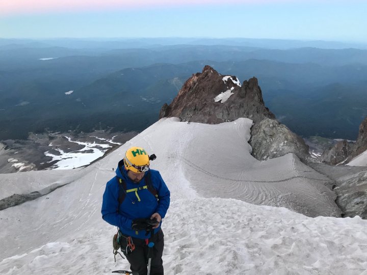 There seemed to be a group of 4 above us (the ones that passed our tent) and another group of 2 on their way just below us. The snow was great. Crunchy. The crampons dug in beautifully. The weather was perfect. Cool, but not quite cold. We made fast pace up towards the right side of Crater Rock. With Devil’s kitchen to our right and the smell of the toxic fumaroles we quickly continued upward to a shelf looking up the hogsback towards the pearly gates. Daylight was coming in now. Maybe 445-5am.