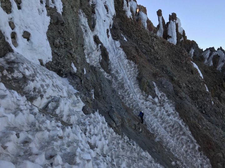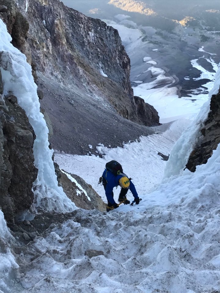 We started to make our way up towards the Bergshrund, which was very open and exposed. Carefully skirting around the right side of it we made it to the bottom section of the pearly gates. Conditions were not “ideal”. Alot of melt had happened already and this made for closer to ice climbing than what we cared to do. We got about half way up the right side of the pearly gates when we got to a section of ice with flow running underneath it. This was not going to be climbable. We retreated down and examined the left side. It seemed doable. We traversed across to the left side and began climbing up.
