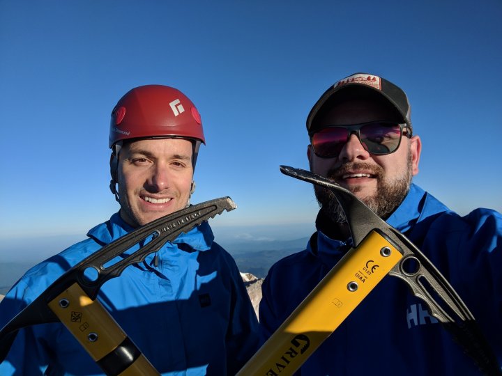 We met the group of 2, cousins from Beaverton that were looking to summit as well. We chatted a bit about route options from where we were at. Tristan and I opted for the Pearly gates route to the top. The cousins chose the Old Chutes. We went up first, and with it being so late in the season and the Berg being so exposed, the cousins elected to let us get up and past the Bergshrund before the began making their way up.