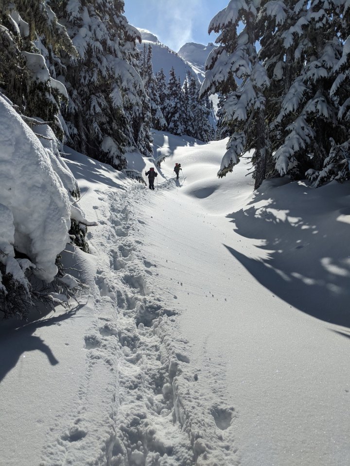 A short trip. Well earned break for all of us. The objective: Garibaldi Lake, with attempt at either Clinker Peak or Mt Price. We’ll see what happens….It was a leisurely start, partially because my Isaac had daycare drop off duties to take care of first, and partially because we still had to pick up Avy gear from the rental shop in Squamish and they weren’t open until 10am. Oh well that’s how it goes sometimes. We just know this means headlamps for the last hour of the hike in.Jason, Matt, and I pull in to Starbucks a few minutes early and grab a coffee before the rental shop opens. Everyone around us looks like they are heading to the mountains, or heading home from the mountains. This is Squamish. We swill back our caffeine and make our way over to the shop to get sorted.Isaac and Ryan show up, and shortly after Tristan. We are all here. We grab our gear and get going, hoping to make up time lost with the late start.The road way in to Rubble Creek is a short stint up the highway. 30km. You can’t miss it… I missed it. Had to double back. Shit. We pulled in and we’re soon met by snow, shallow and then deeper quickly. We know the drill. We will not make it to the parking lot and thus add distance to our trip. Likely about an additional 2km. Shit.A quick dig out on the side of the road for all 3 vehicles, packs on and we’re off. It would be nice if they plowed the road all the way to the parking lot. Grrr.Conditions were less than ideal. 1 degrees and raining. Long slog. Our last hour was travelled by headlamp until we finally got to the lake. It was cold, and we needed food. We huddled in the bear shelter and hammered back some instant meals and tea. Everyone started to settle in. Early night.The next morning we awoke to blue bird skies and pristine untouched snow across the lake.