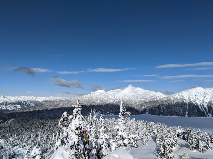 We ate and geared up. Our objective was to see if we could summit Clinker Peak, access by crossing part of the lake. Before we set out we said our goodbyes to Tristan who had to bail early to get back home.The lake crossing was amazing, and some unreal views of Black Tusk, completely snow covered.