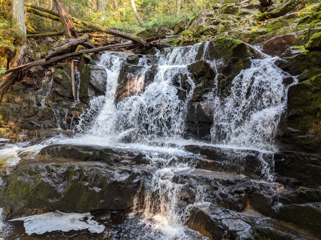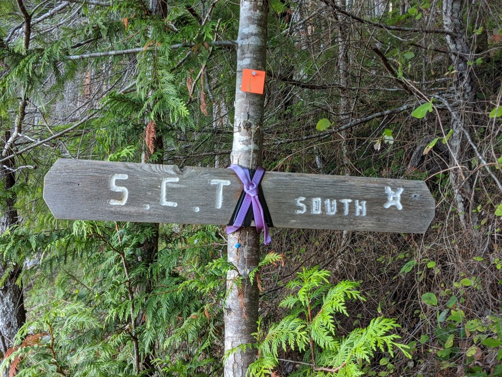 I awoke early to the sounds of empty logging trucks rumbling down the road. Homestead is situated on a spur road next to an active logging road. It was cooler than the previous 2 days had been, a promise that we are in fall. I opted for a breakfast of coffee and Mr Noodles. A little odd, but it worked. I set out and made my way up into the next section of trail, a zig zag of shared trail system until the SCT splits off and wanders around Rieveley Pond and the 3rd hut of the trail. A nice looking place to stay when the huts reopen again. Continuing on I pass Appleton Creek a few waterfalls, and Yeth Theth lake, then Sliammon Lake. I took a breather at Kokanee camp. Heals were starting to become problematic but I pushed on. The next camp was only a few more kms away and named Shangri-La. It had to be worth it,ya?