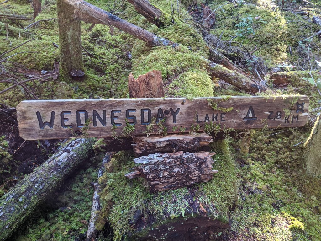 After the first few kms the forest gets a lot more dense, and ferns begin to take over the forest floor. There is also some sizeable giants for trees in here. Extremely impressive. Wandering past old stumps too, relics from the past. I made my way up to a big hill and took a break, I was hot, sun was beaming down on me. I dropped my pack and laid down for a while. Only a few more kms to go today. Thank goodness. I arrived at Wednesday Lake around 330pm and flat out called it quits for the day. I set up camp, ate dinner and made a few runs for water before it was lights out. 12km done.