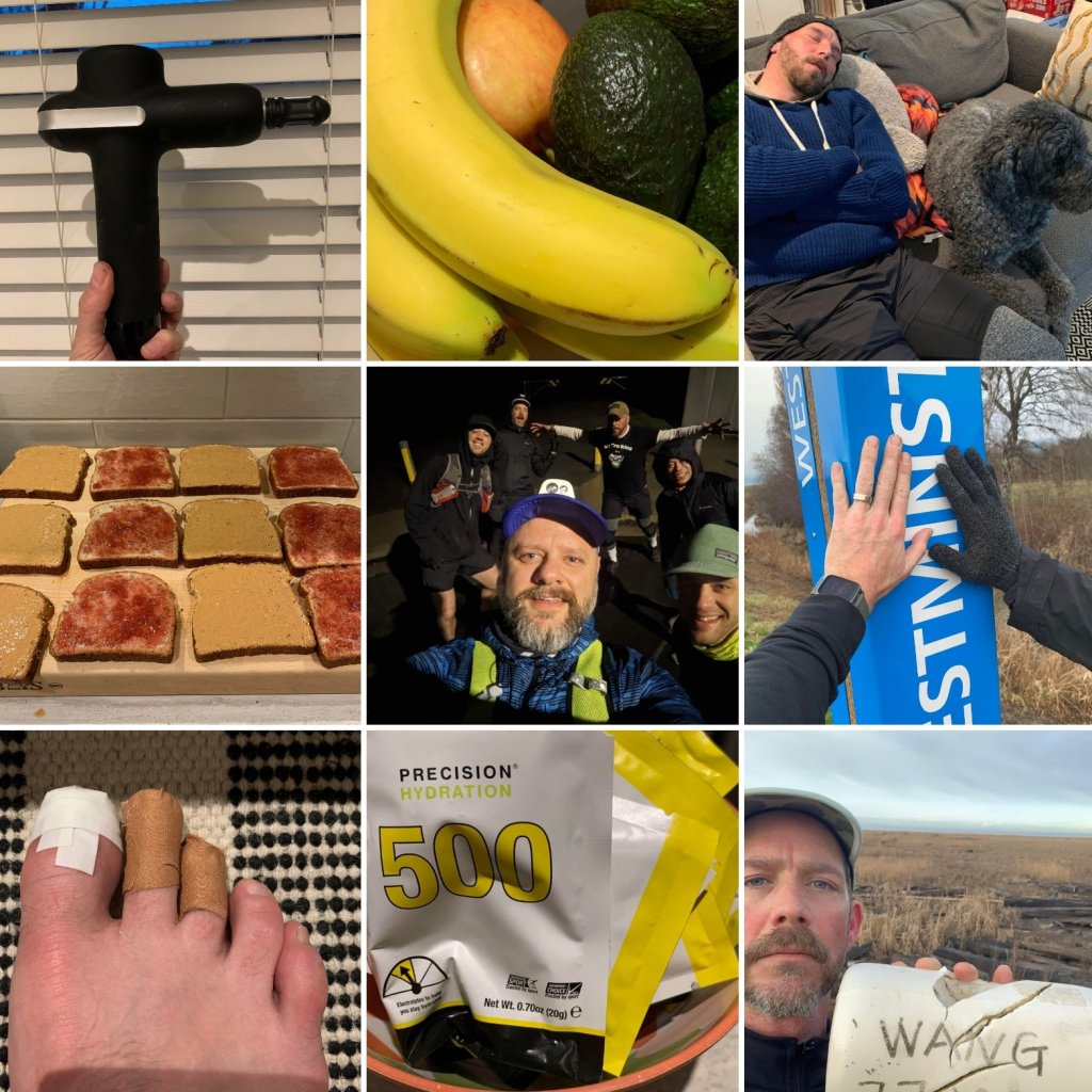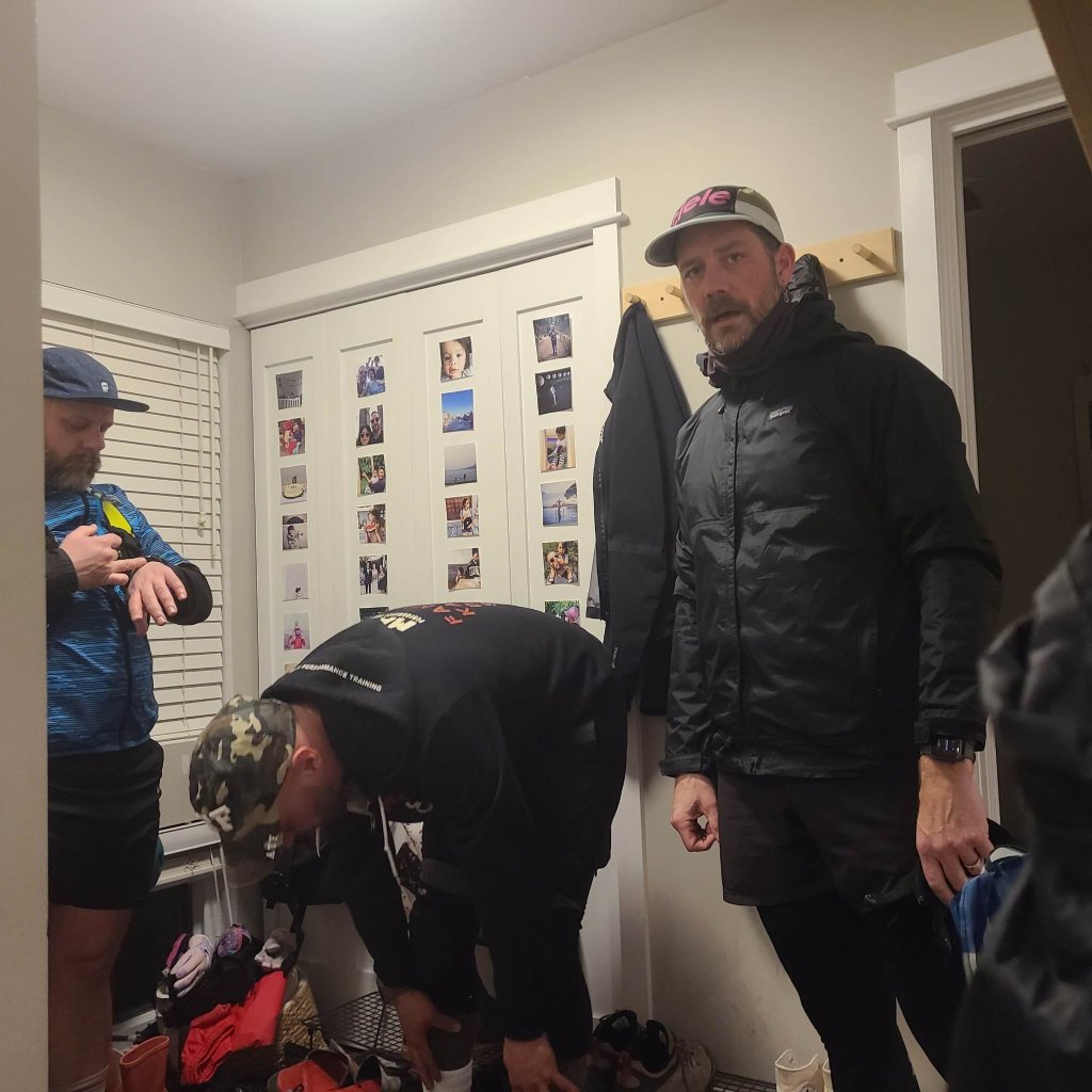We set up Basecamp at Martins place, which is situated right next to the West Dyke Trail, making it a perfect location to run the challenge. We would be held up here between runs for the next 48 hours. I packed what I needed, warm running clothes, rain slicker, Merino wool top? Yes I better, weather this weekend is flirting with snow. Sleeping bag and foamie. Now I brought them, but in truth this was just giving myself false promises. #nosleep.