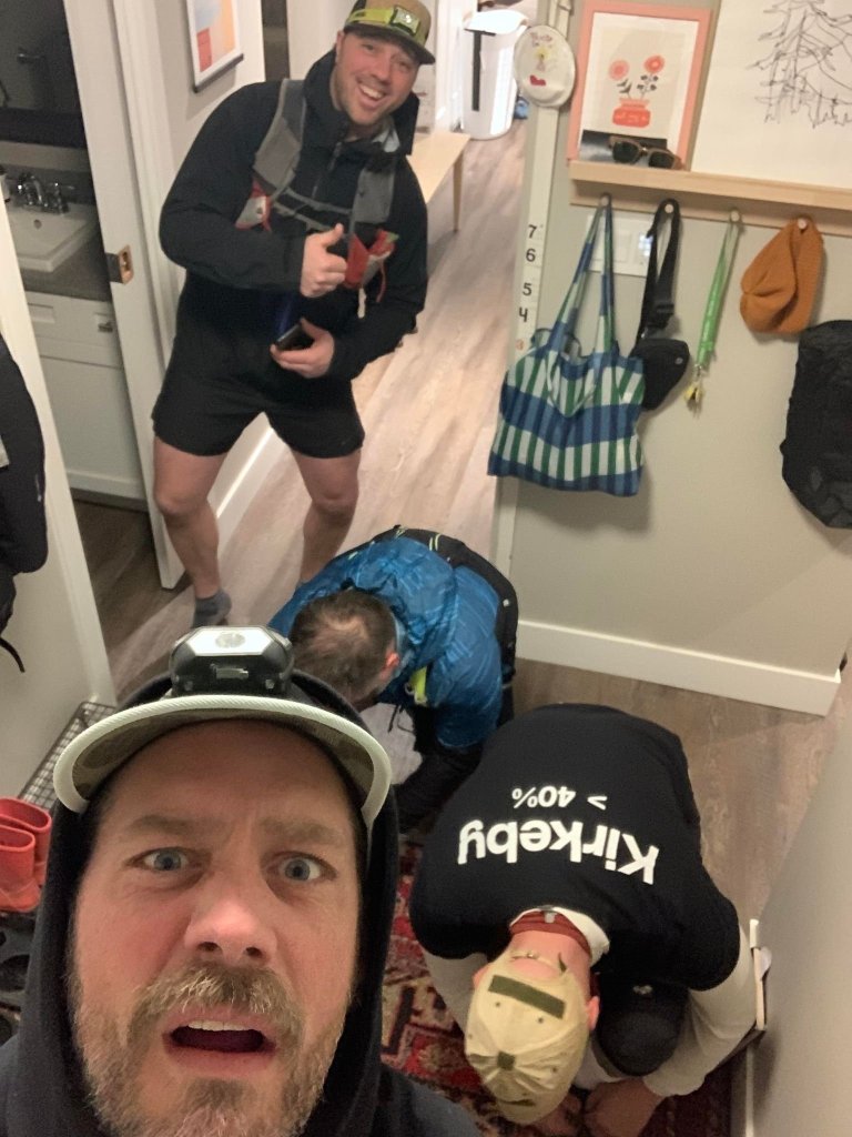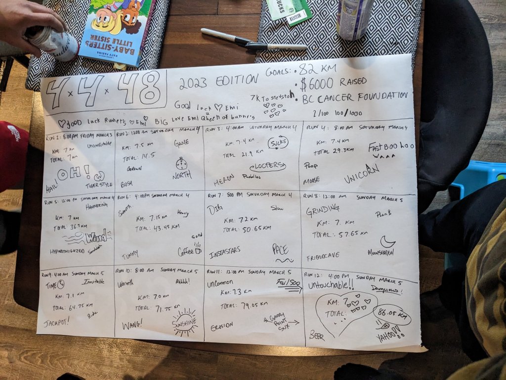 Friday night has come. 8pm is a few minutes away. We converge to the kitchen, decide which route we will start with, (we were alternating a north route and a south route, both of the same distance) have a last swig of water grab our jackets and head outside. This will be life for the next 48 hours. It’s go time!