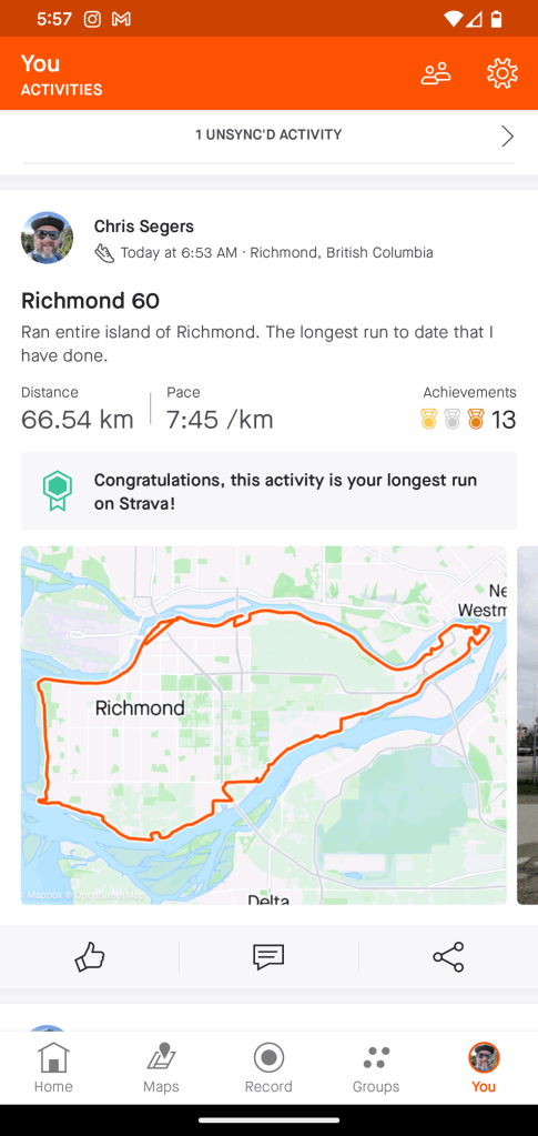 Have you ever run around your city? No your whole city, like the whole fucking thing? Like every metre of its border?… As a runner I have. It was a lot bigger (63kms round and round) and not as easy to do as I thought. Challenges with reroutes and lack of accessibility to parts of the city as well as some fairly sketchy roads with no more than pylons to save me from semi trucks promising to pancake my existence. I live in Richmond BC. It got me thinking. Do people even do this? Or is it just me?